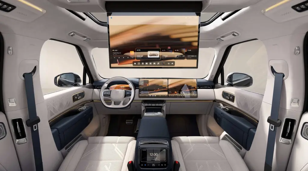 Das Besondere daran: Das OLED-Display in der zweiten Reihe lässt sich elektrisch verschieben. Ziel ist es, dass auch die hinteren Reihen mehr sehen können. Der neue Zeekr 9X hat nämlich eine dritte Reihe. Und damit man ganz hinten nicht „zu kurz kommt“, lässt sich der an der am Fahrzeughimmel befestigte Screen um bis zu 88 Centimeter verschieben.