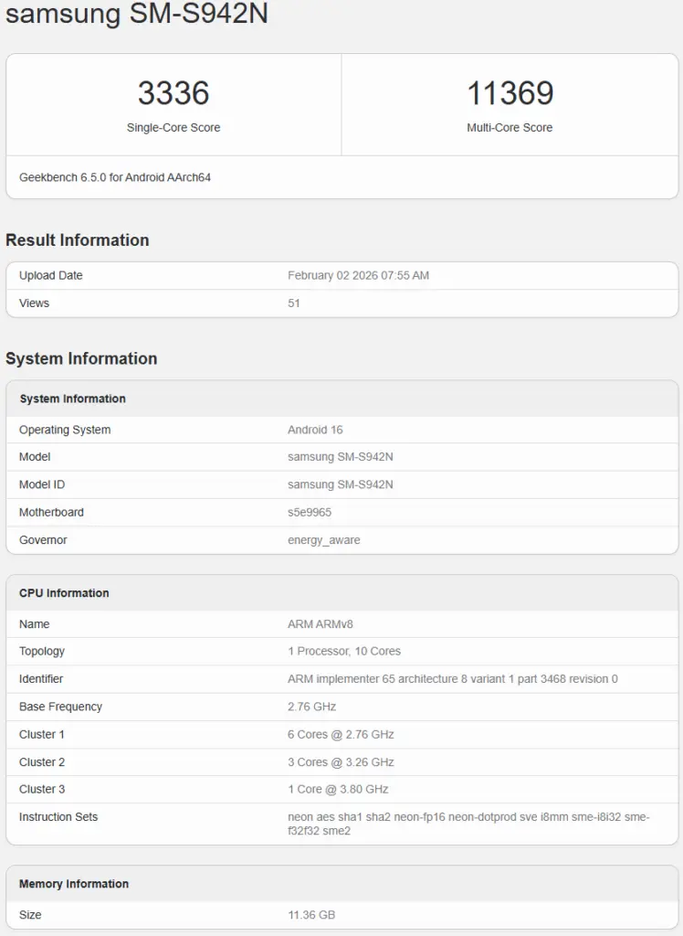 Das Galaxy S26 Basismodell erreichte im Geekbench-Test 3.336 Punkte im Single-Core und 11.369 Punkte im Multi-Core. Diese Werte liegen auf dem Niveau des Snapdragon 8 Elite Gen 5. Samsung hat die CPU-Leistung gegenüber dem Exynos 2500 um 39% gesteigert.