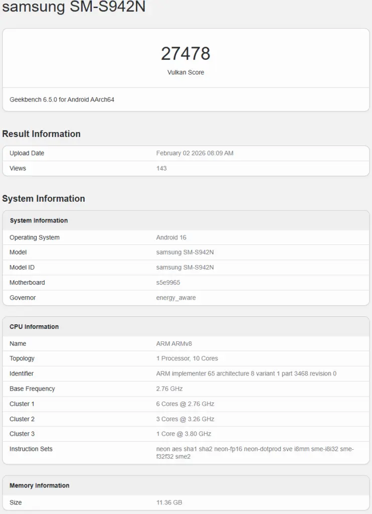 Im GPU-Benchmark erreichte das Galaxy S26 27.478 Punkte in Vulkan. Das liegt nahe an den üblichen ~25.000 Punkten des Snapdragon 8 Elite Gen 5. Für Exynos-GPUs ist das ein gewaltiger Fortschritt.