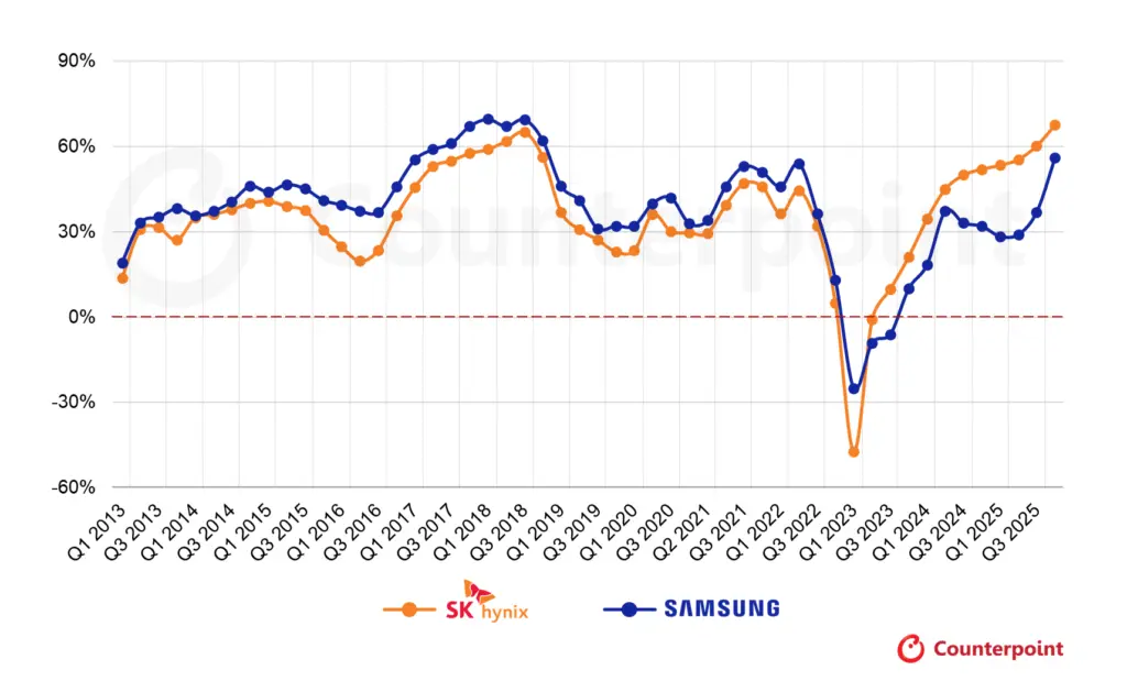 Mittlerweile sieht es aber wieder deutlich besser aus: Samsung fährt in Q4/2025 knapp hinter SK Hynix 26 Mrd. Dollar Gewinn ein. Das war ein neuer Rekord im Speicher-Geschäft für die Koreaner. In der folgenden Grafik lässt sich die Entwicklung vom Gewinn im Bereich Memory für Samsung (blaue Linie) sehr gut erkennen.