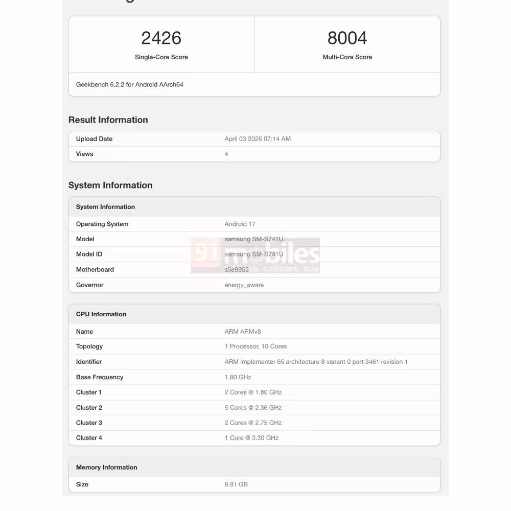 Die Zahlen: 2.426 Punkte im Single-Core, 8.004 Punkte im Multi-Core. Das getestete Gerät läuft schon mit Android 17 und hat 8 GB RAM an Bord. Das Galaxy S26 FE dürfte später im Jahr mit One UI 9 unter der Haube an den Start gehen.