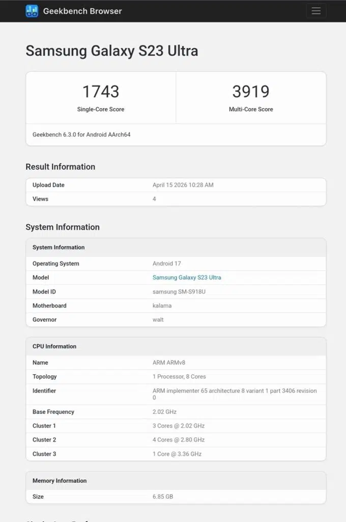 Samsung testet intern bereits One UI 9 auf Basis von Android 17, und zwar auf dem Galaxy S23 Ultra. Eine Geekbench-Sichtung machte über Social Media die Runde und zeigt die US-Variante des Flaggschiffs (Modell SM-S918U) mit Android 17. Die Benchmark-Werte fallen dabei deutlich niedriger aus als gewohnt, was in dieser frühen Testphase aber nichts Ungewöhnliches ist.